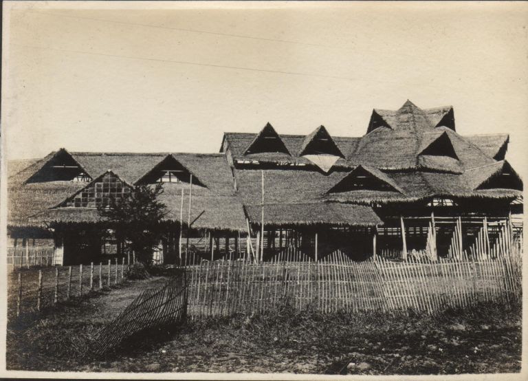 Subject: An open-air cock-pit, a structure housing cockfights and their spectators. Long considered a sport in the Philippines, cockfights brought large crowds of spectators, many of whom would place