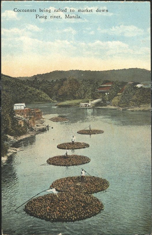 Cocoanuts being rafted to market down Pasig river, Manila.