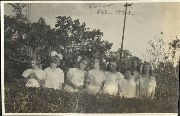 Subject: Group of eight American girls in white cotton dresses pose behind a hedge at a party. (See OFI-001454 for a similar image with many of the same girls).