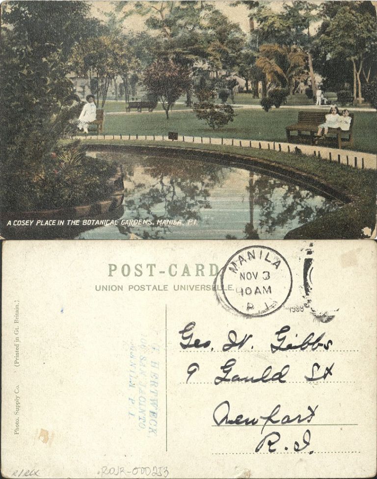A cosey [cozy] place in the Botanical Gardens, Manila, P. I.