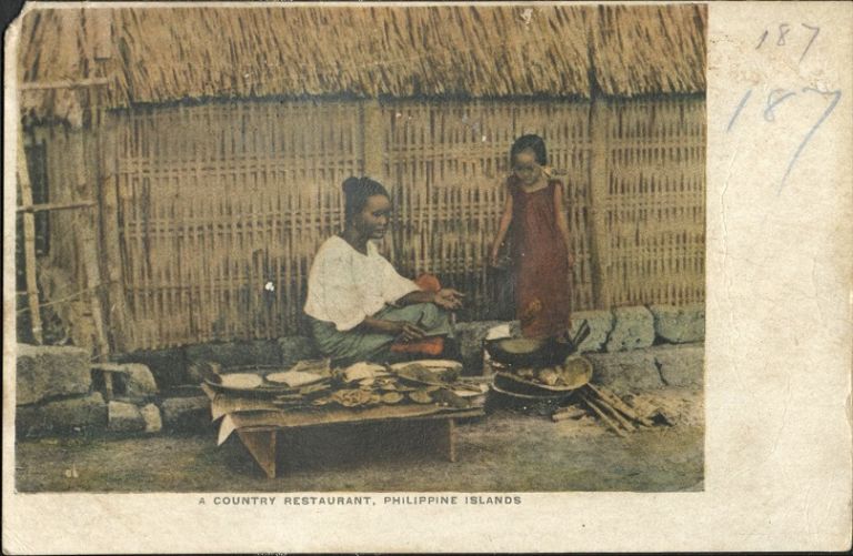 Subject: Woman, seated, and girl, standing, offer cooked foods for sale on a Philippine sidewalk.