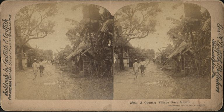 Griffith #F2805. Filipinos walking in street in village lined with trees and nipa huts.