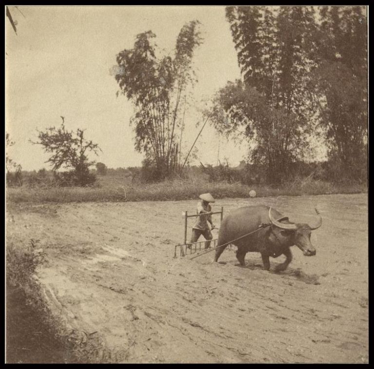 Subject: A Filipino farmer uses a carabao to plow or harrow a very muddy rice paddy.