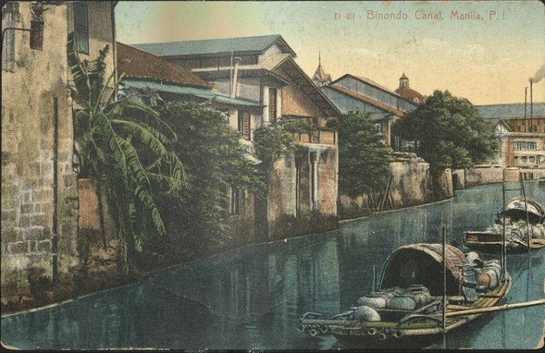 Subject: Two cascos along Binondo Canal, buildings and church tower on left.