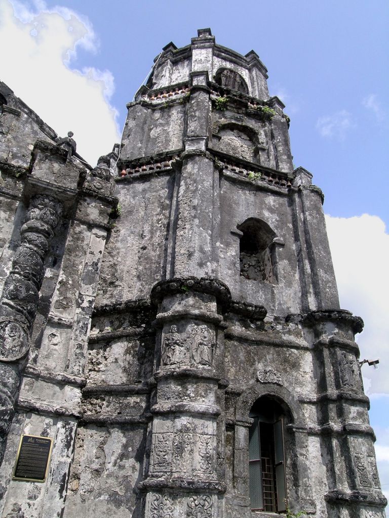 Subject: Close-up of the bell tower of Daraga Church. Nuestra Se�ora de la Porteria Parish Church, commonly known as Daraga Church, is in Daraga, Albay. Daraga was established by people relocating f