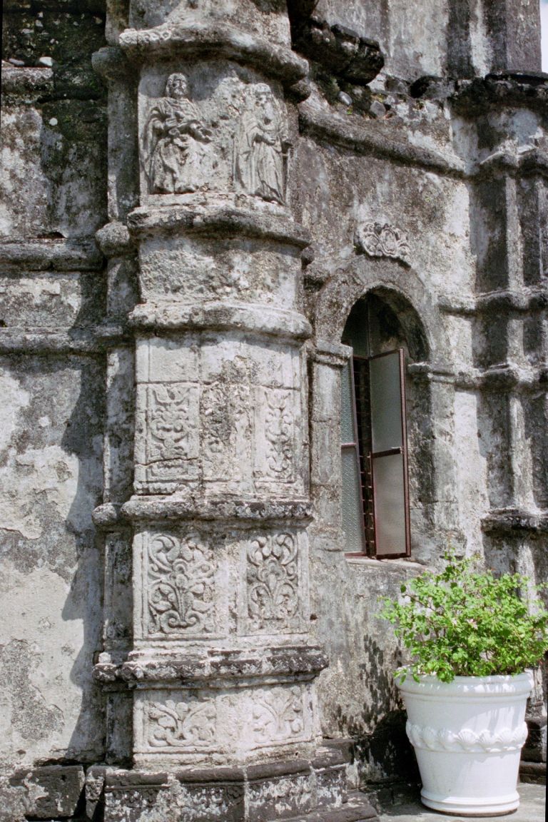 Subject: Detail of stone carving on a column of Daraga Church. Nuestra Se�ora de la Porteria Parish Church, commonly known as Daraga Church, is in Daraga, Albay. Daraga was established by people rel