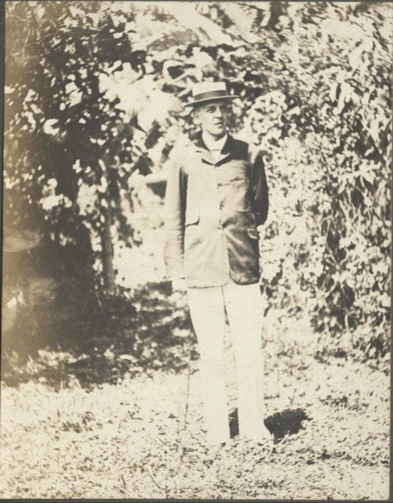 Subject: Portrait of an expatriate Caucasian man in coat and hat standing outdoors in front of foliage. See also OFI-002357.