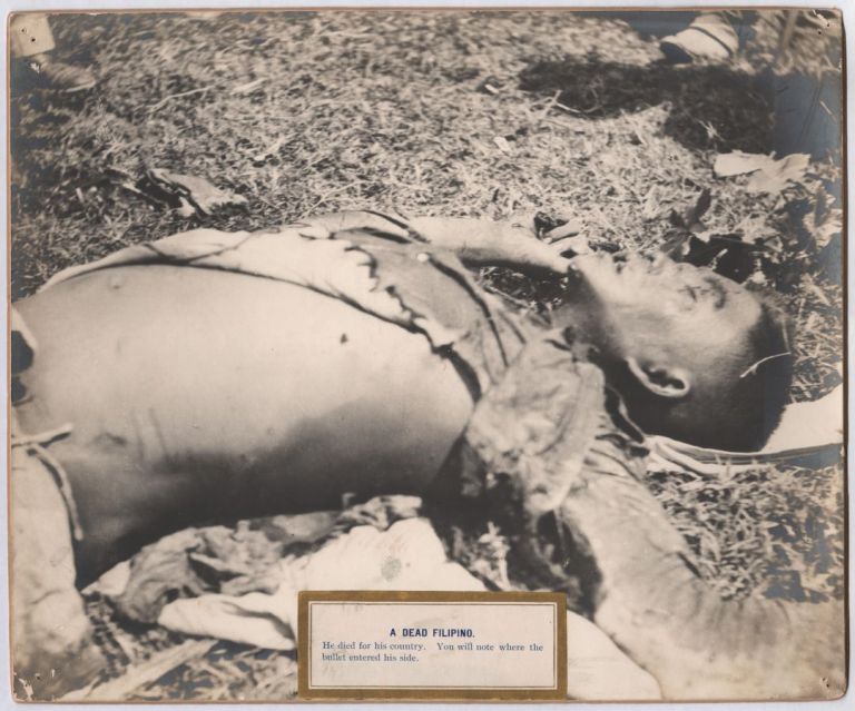Close-up view of a dead Filipino soldier killed on the battlefield during the Philippine-American War. The caption continues: "He died for his country. You will note where the bullet entered his side.