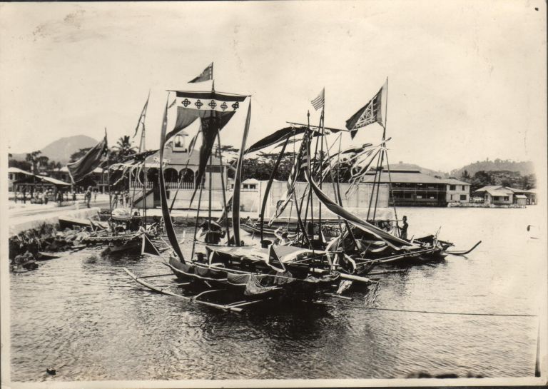 Subject: Waterfront scene, most likely at Jolo (that appears to be Mt. Dajo in left distance; see OFI-004418) featuring vintas, decorated sailing outriggers used in the Sulu Sea.