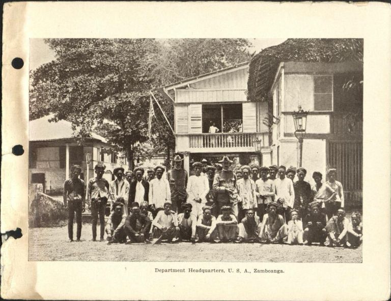 Subject: Two U.S. soldiers pose with local Filipino residents outside building in Zamboanga. Givens was the post photographer at the Presidio of San Francisco starting in 1899. In 1900 he