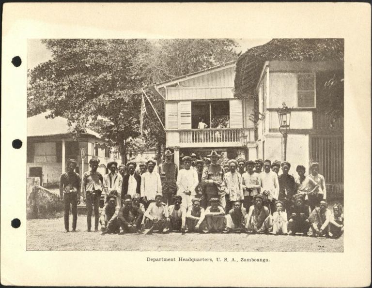 Subject: Two U.S. soldiers pose with local Filipino residents outside building in Zamboanga. Givens was the post photographer at the Presidio of San Francisco starting in 1899. In 1900 he