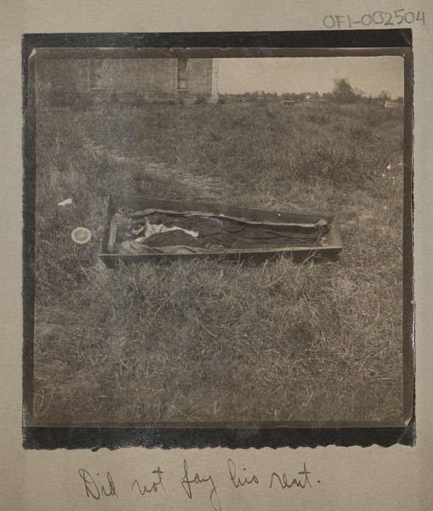 Subject: An open casket containing a skeleton wrapped in burial cloths lies in a field. Burial vaults were typicallly leased and re-used, and families of deceased who did not keep up on the burial lea
