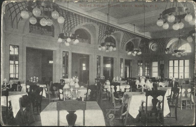 Subject: Formal tables with white dining cloths in dining room and restaurant in the Manila Hotel in Ermita.