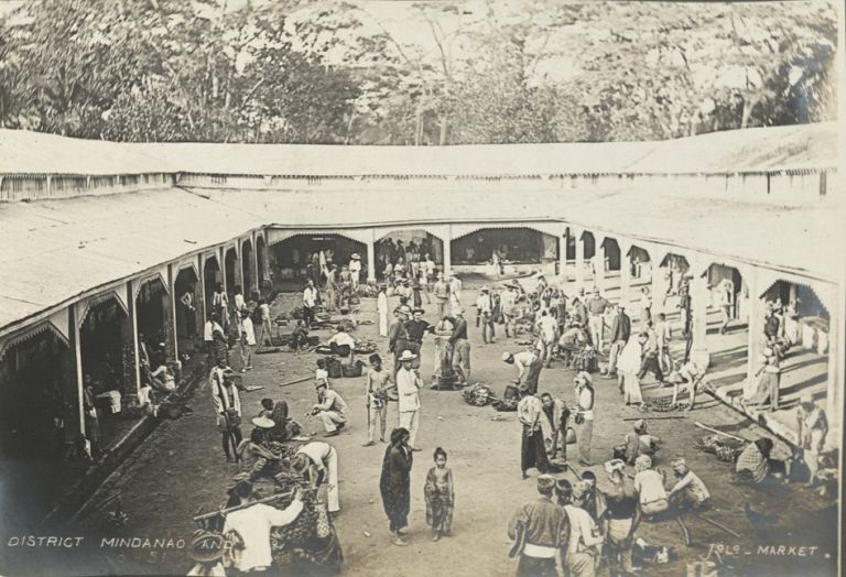 Subject: American soldiers mingle with local Filipinos at a covered market in Jolo. Notice public water-supplu fountain in middle of courtyard. See also OFI-000563 for a different Jolo market.