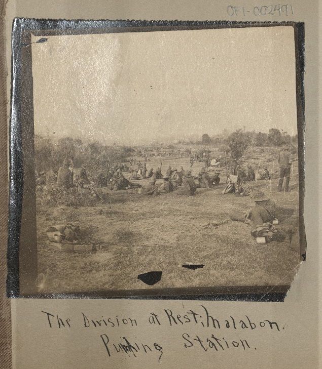 Subject: Group of U.S. soldiers, presumably the 1st South Dakota Volunteers, at rest at a pumping station in Malabon. Filipino guerrilla actions during the Philippine-American War often focused on str