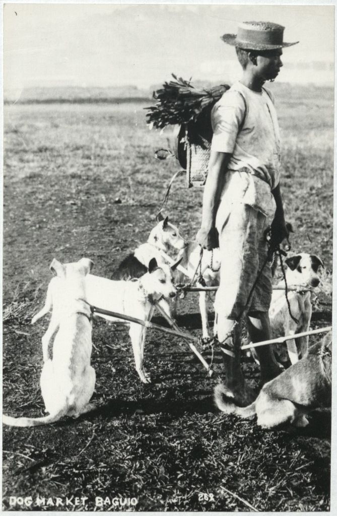 Man with six dogs at the dog meat market in Baguio. The Philippine dog meat trade is still primarily centered in Baguio. Historically, it was associated with celebratory events and rituals and rituals of mourning and only affected a small number of dogs.