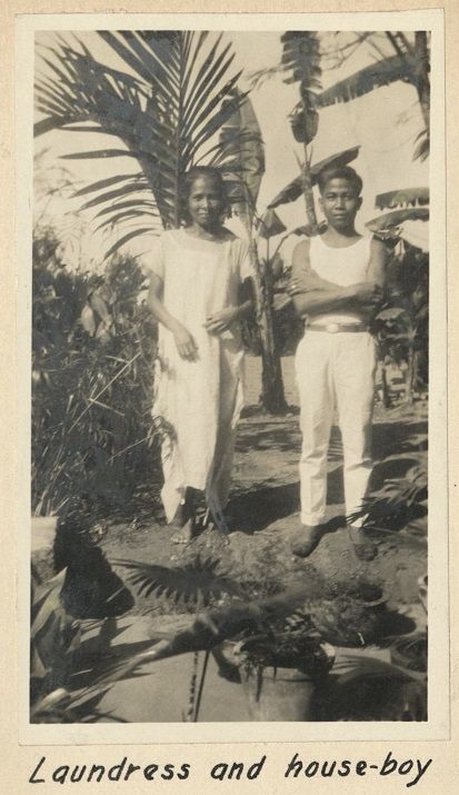 Subject: Filipino woman and man, both domestic servants, pose outdoors amid palm and banana trees.