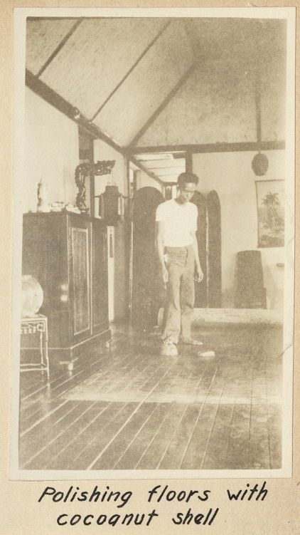 Domestic servants - Polishing floors with cocoanut [coconut] shell.