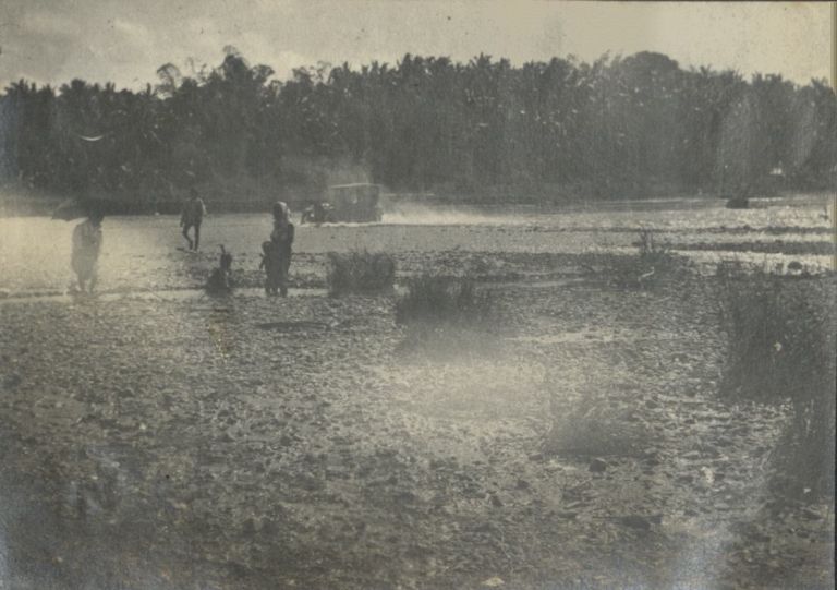 Subject: A Ford Model T splashes down the Guimbal River in Iloilo province, using it as a highway. Filipinos wade in a small canal dug from the flat riverbank.