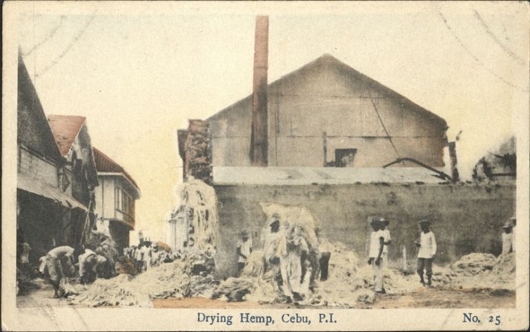 Subject: Workers sorting and bundling Abaca (hemp fibers) in front of factory building in Cebu.