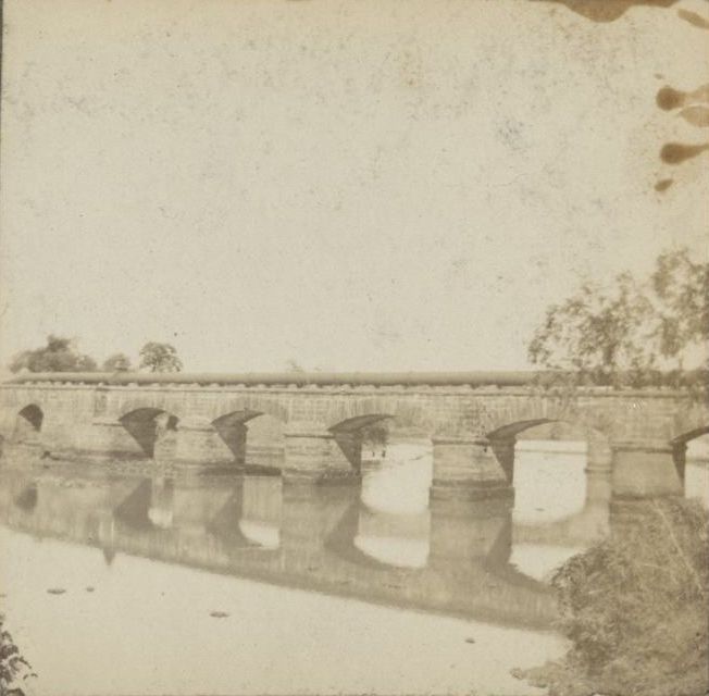 Subject: A stone arch bridge over a wide river. El Deposito was a Spanish-built underground water reservoir in San Juan del Monte, now the city of San Juan in Metro Manila. It served as Man