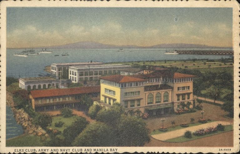 Subject: Looking down on Elks Club and Army and Navy Club in foreground, built on reclaimed land near Luneta; ships and pier in Manila Bay.