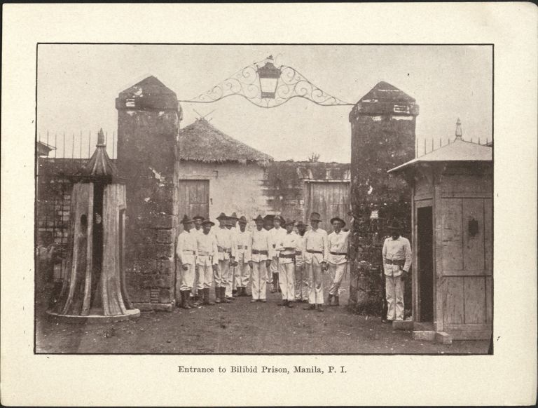 Subject: Prison guards pose at the entrance gate to Bilibid Prison. The guard house to the left is an architectural gem. Givens was the post photographer at the Presidio of San Francisco
