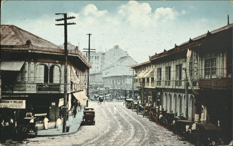 Curve in Escolta Street in Binondo, Manila, with automobiles and calesas along curb.