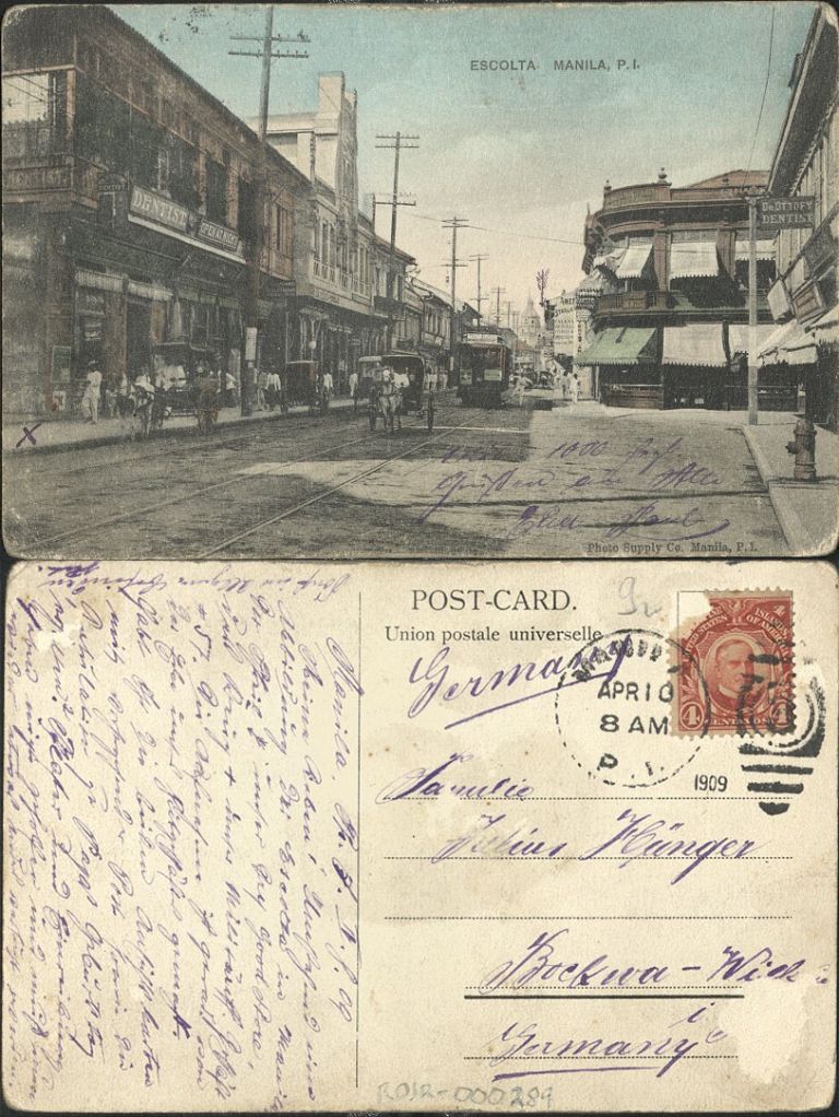 Subject: Street-level view of Escolta Street, buildings, calesas and streetcar.