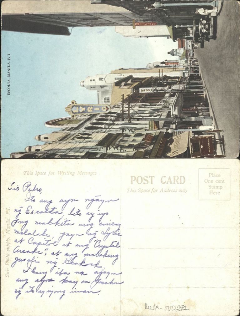 Subject: Escolta Street, Manila; 1920s automobiles and calesa parked along store fronts and Lyric theater.