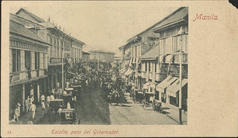 Subject: Street view of Manila�s Escolta Street commercial district packed with calesas.