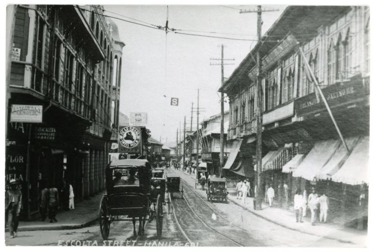 Street-level view of Escolta Street, buildings, calesas and streetcar tracks. A circa 1950s reprint of a circa 1900-1910 image.