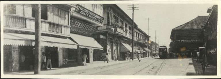 Subject: Street-level view down Escolta St. in Binondo, Manila, with shops, trolley car, calesas and pedestrians.