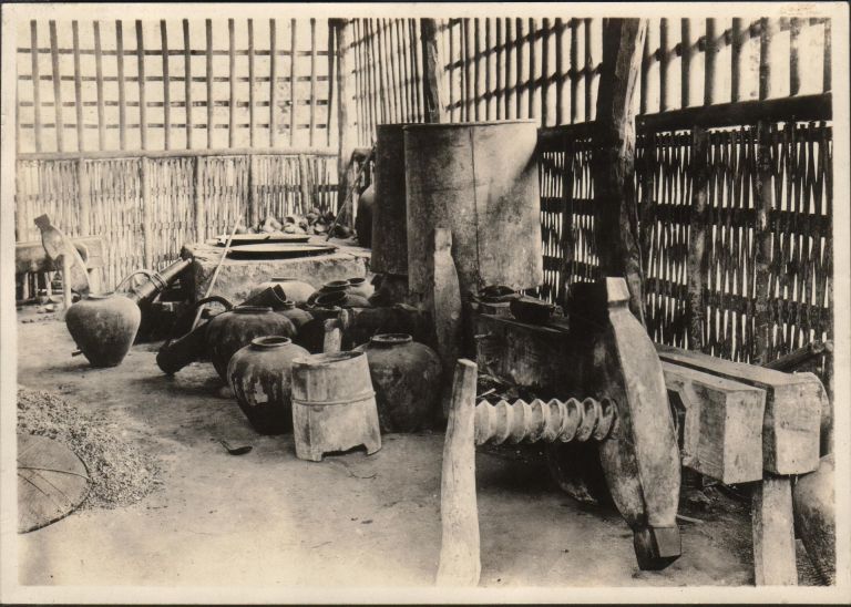 Subject: Primitive but effective screw press collects coconut oil by squeezing copra under blocks of wood, Tightening the wooden screw into the slabs of wood compresses the material between the massiv