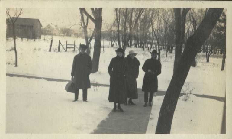 Subject: Is this the Kincaids (? - the family compiling this album) posing on a snowy sidewalk in rural Nebraska, or relatives? What's unclear is whether the family travelled from the Philippines to