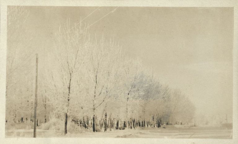 Subject: A chilly winter scene in Exeter, Nebraska - row of trees encased in snow and ice. What's unclear is whether the family travelled from the Philippines to Nebraska for a visit, or if these phot