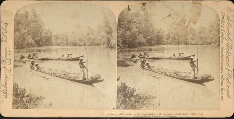 Underwood #U365b. Filipinos use long bamboo poles to propel dug-out canoes full of coconuts along Imus River in Cavite, Philippines.