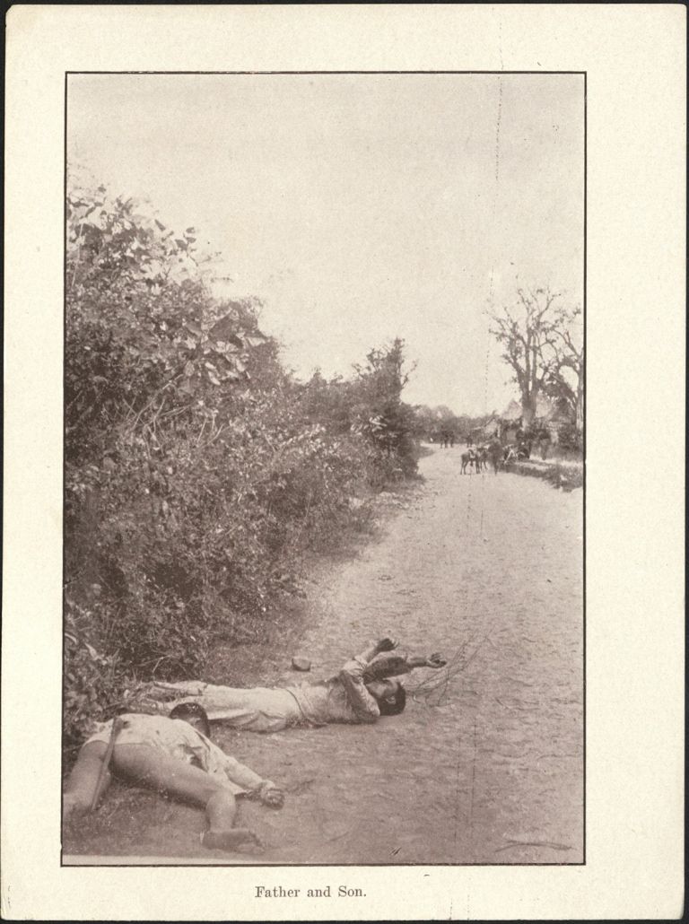 Subject: Man and a boy lie dead in a road, with soldiers in the distance. Givens was the post photographer at the Presidio of San Francisco starting in 1899. In 1900 he traveled to the Phi