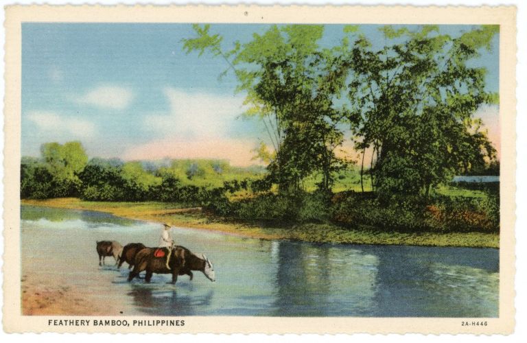 Tall feathery bamboo (Bambusa vulgaris) on the far shore of a river as man riding carabao crosses.