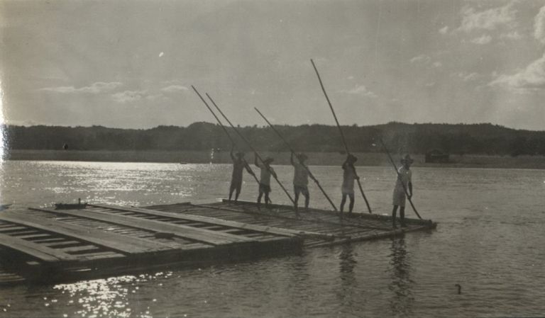Subject: Five men use bamboo poles to push an empty wooden ferrt across the Abra River. The river passes through Mountain Province and Ilocos Sur as well as its namesake province, Abra.