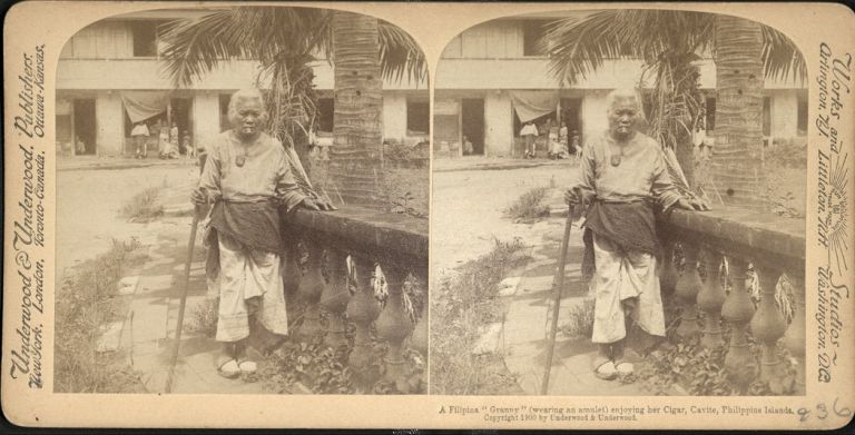 A Filipina "Granny" (wearing an amulet) enjoying her Cigar, Cavite, Philippine Islands.