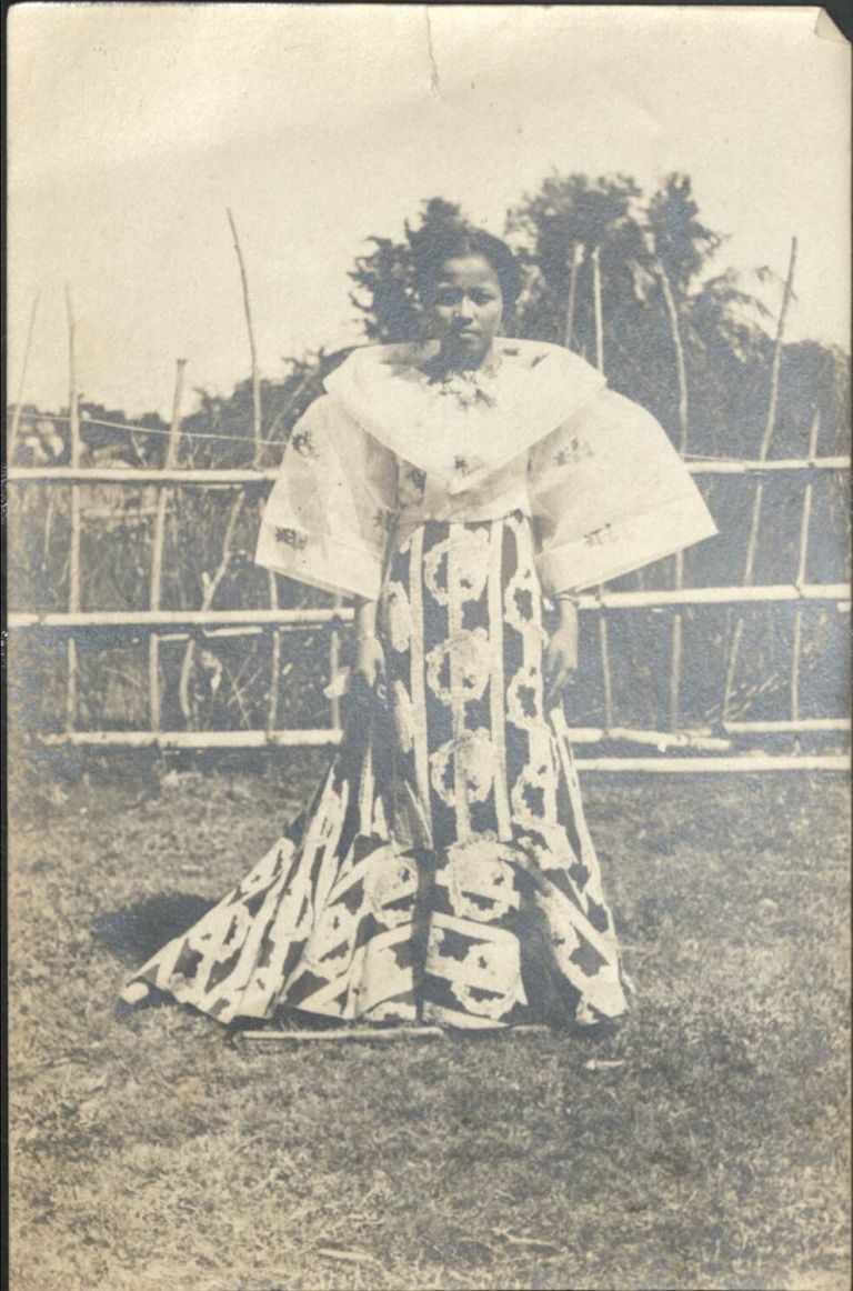 Subject: A Filipino woman waering a very elaborate, formal embroidered dress poses outdoors before a bamboo fence.