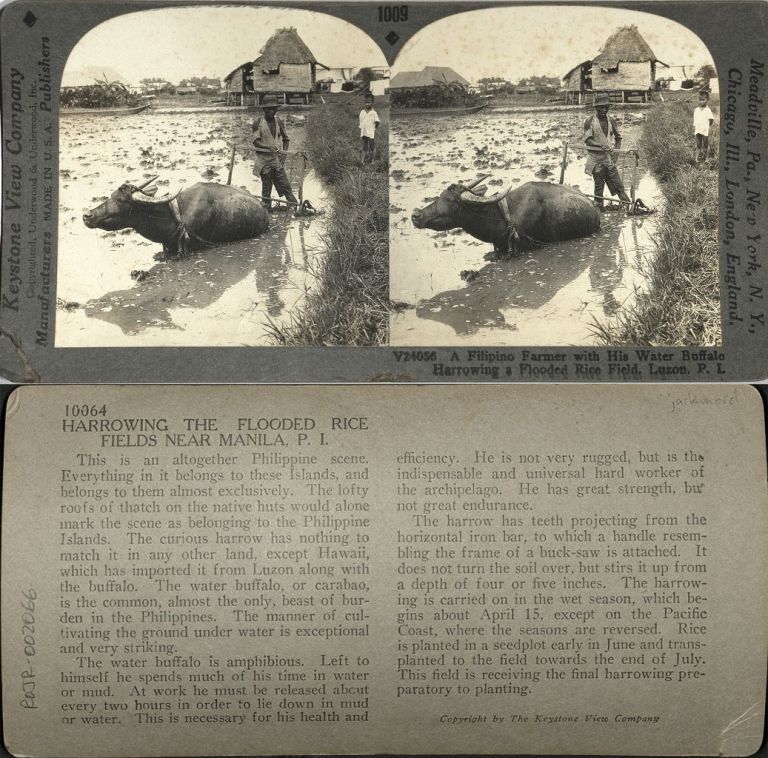 Keystone #K24056-I. A Filipino farmer uses a carabao to plow and harrow muddy rice fields in the Philippines.