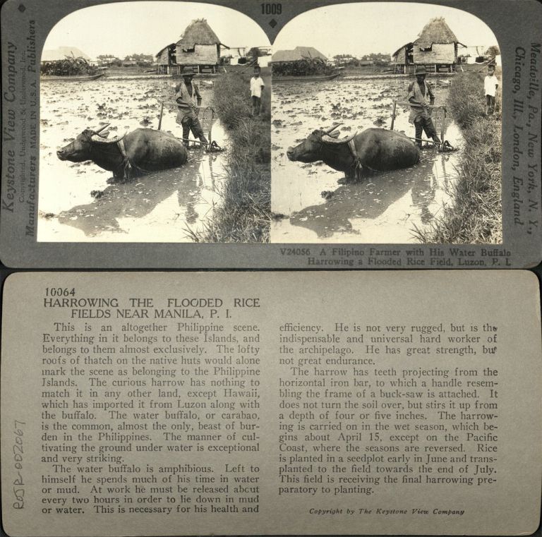 Keystone #K24056-I. A Filipino farmer uses a carabao to plow and harrow muddy rice fields in the Philippines.