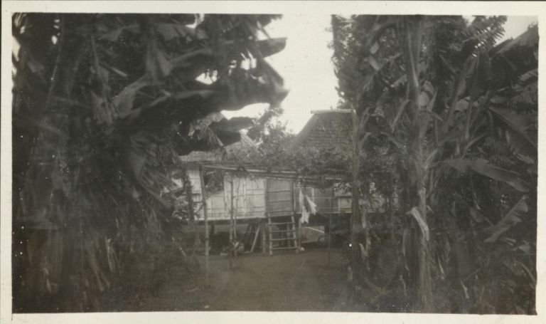 Subject: A nipa hut sits in a clearing surrounded by banana plants, or possibly abaca.