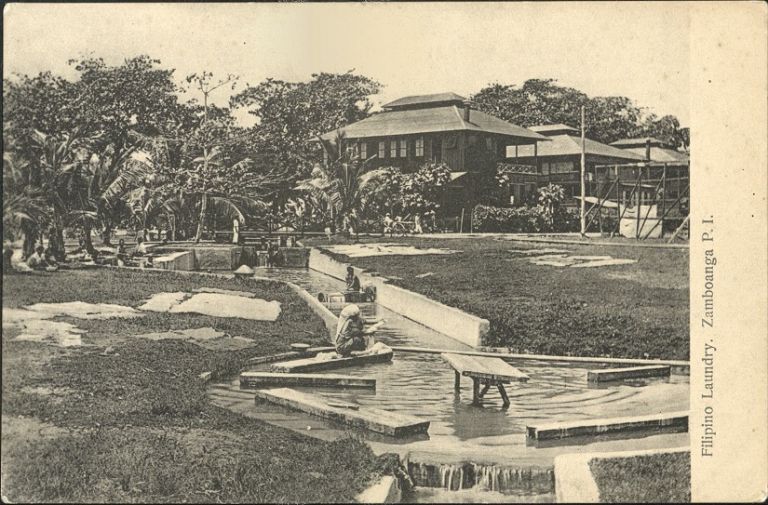 Subject: People doing laundry in manmade series of cascading ponds in Zamboanga City.