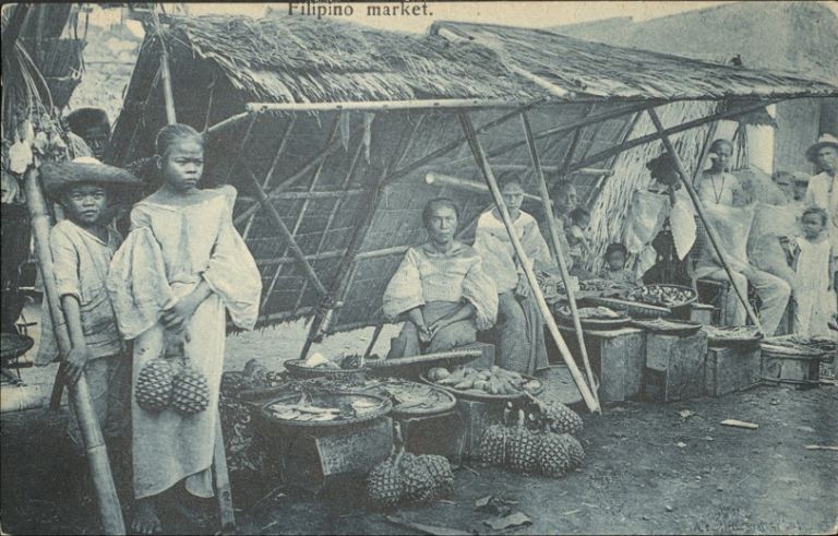 Subject: Filipino women and children selling produce at covered stalls. See also OFI-002370, same image, location attributed to Albay Province.