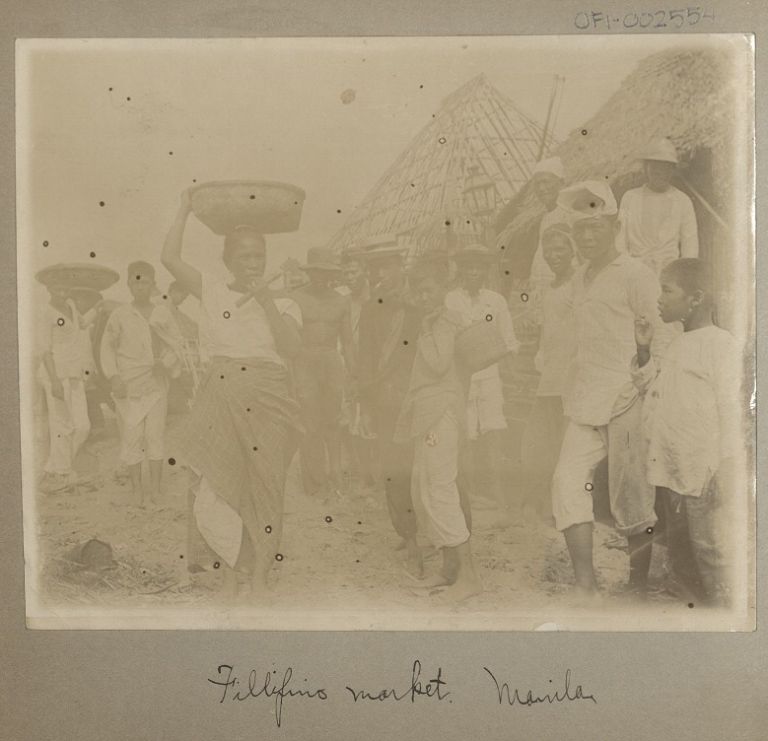 Subject: Filipino men and women at a market in Manila. We can't see what's in the womens' head baskets, but it is likely produce. Lieut. Munson M. Z. Guthrie was an officer in Company A, 1st South Da