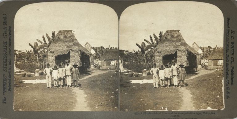 H. C. White #W3554. Six Filipino boys pose outside of a nipa hut used as a schoolhouse.