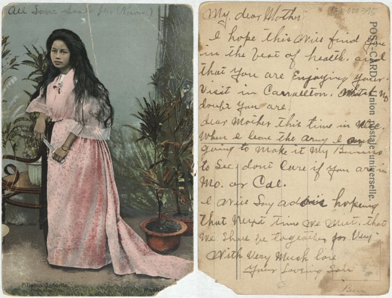 Subject: Filipino woman in traditional dress stands for a portrait next to a chair and potted plants.